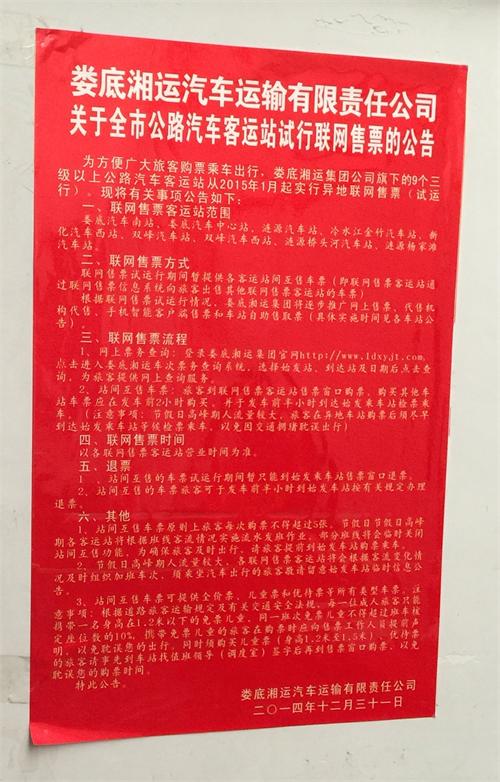 2015年春運(yùn)將至,為方便市民購買回家車票,給廣大市民提供快捷、優(yōu)質(zhì)的出行服務(wù),婁底湘運(yùn)公司創(chuàng)新客運(yùn)售票服務(wù)方式。從元月8日開始,公司轄下的婁底汽車站、婁底汽車南站、新化汽車西站、冷水江金竹車站、雙峰汽車站、雙峰汽車西站、漣源汽車站、漣源橋頭河汽車站、漣源楊家灘汽車站九個(gè)客運(yùn)汽車站全面實(shí)行聯(lián)網(wǎng)售票,旅客可就近在其中任意車站購買其他車站始發(fā)車票!